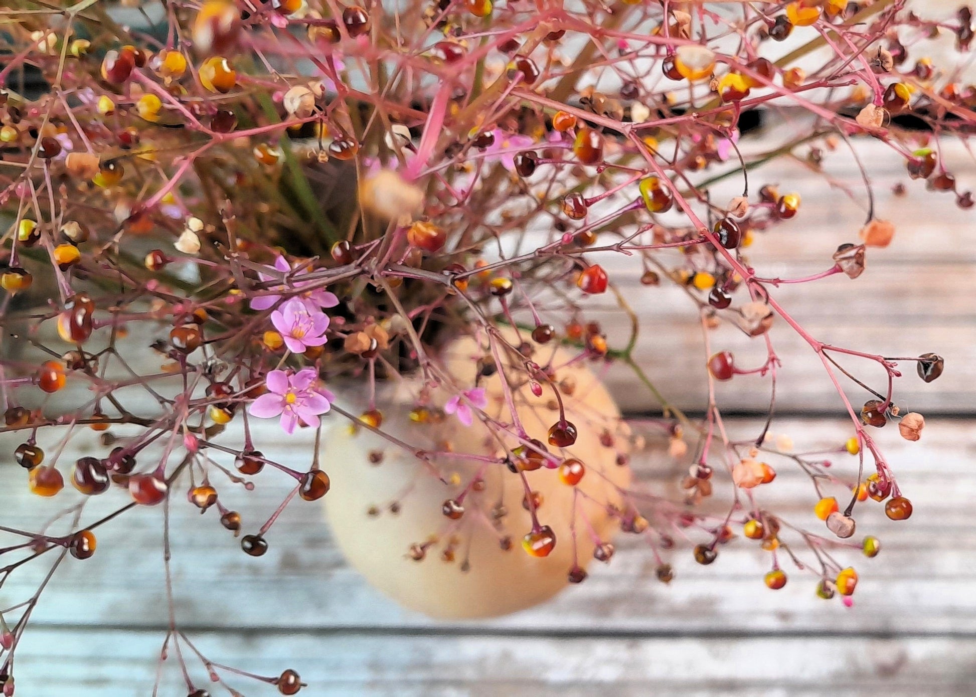 While the Fame Flower’s blooms are small, they are plentiful & really stand out on thin stalks held over the foliage, luring bees & butterflies to your garden. Then, get ready for the real show to begin! These plants are most popular for their ‘Jewels of Opar’ or in layman’s terms, their seed pods. Lol. Many consider them to be the headliner of this class act. The pods appear in shades of red with some purple, orange, & yellow tones thrown in. They are very popular for cut & dried arrangements.